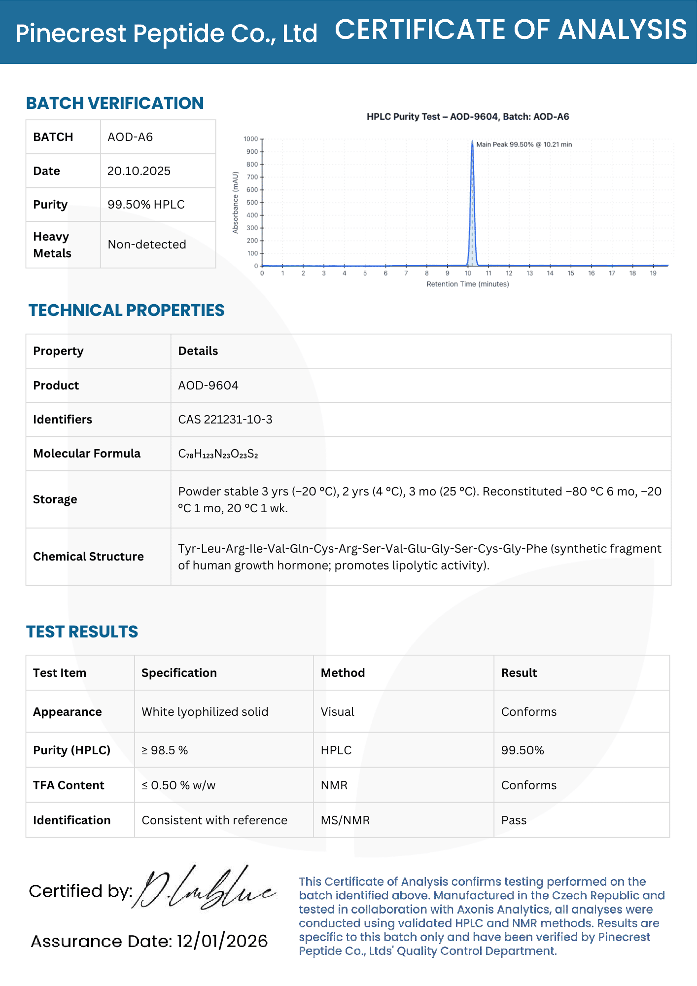 A: Research-grade AOD9604 should be ≥98.0% purity by HPLC analysis . Pinecrest’s AOD9604 is ≥99% with full documentation, exceeding industry standards.