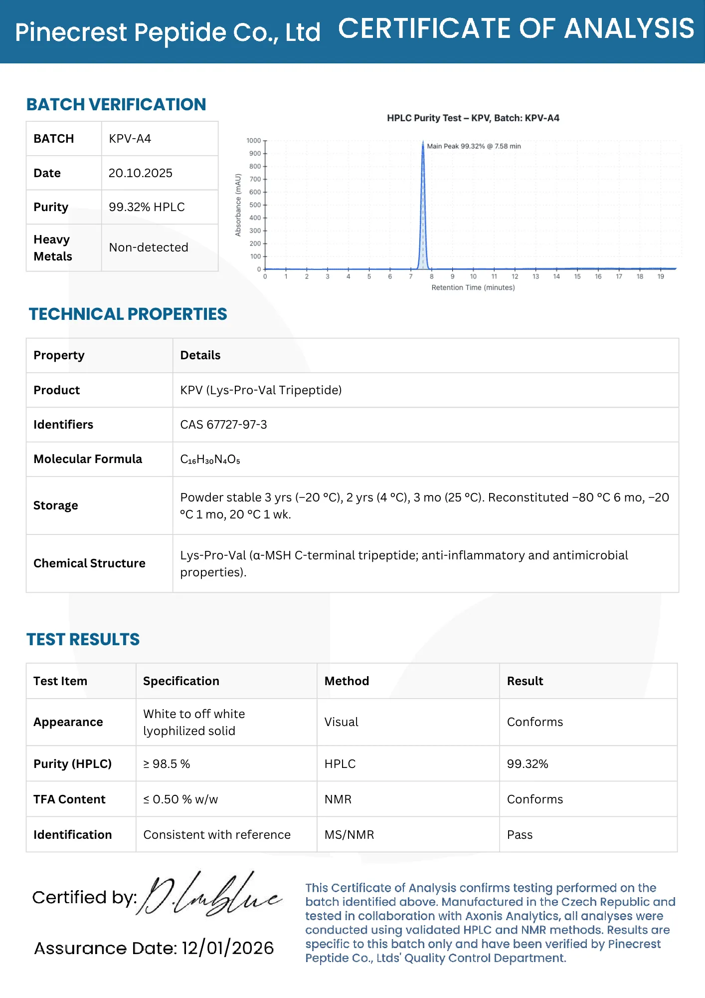 A: Research-grade KPV should be ≥98% purity by HPLC analysis . Pinecrest’s KPV is ≥99% with full documentation, including third-party testing for identity, purity, sterility, and endotoxicity .